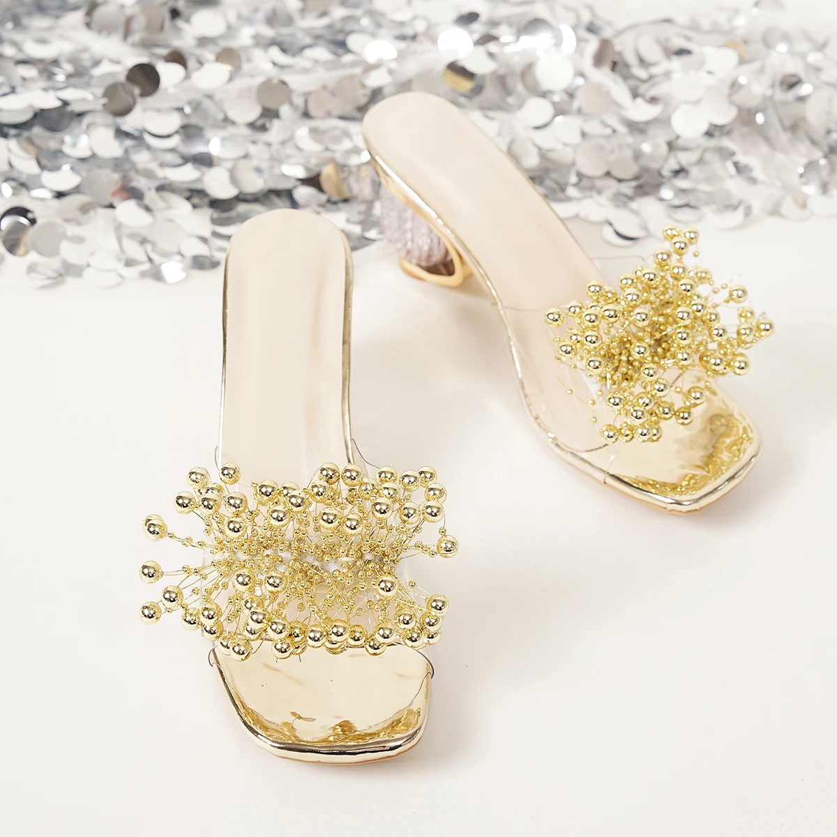Embellished sandals, featuring delicate water diamond flower accents and a transparent PVC upper that catches the light beautifully.