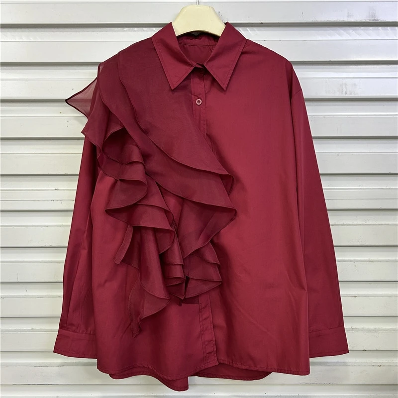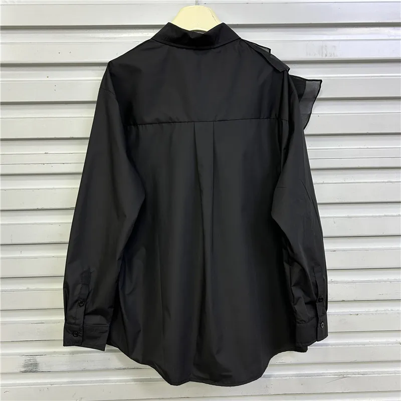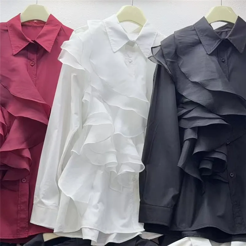 Elevate your wardrobe with this refined long-sleeved shirt, featuring an exquisite ruffle-edge splicing design that adds contemporary flair. The single-breasted silhouette and relaxed fit offer versatile styling options for both casual and polished occasions. Crafted with attention to detail, this piece seamlessly transitions between seasons, making it an essential addition to any sophisticated woman's collection.