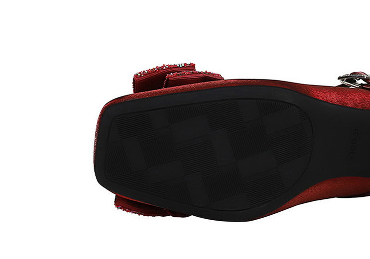 These women's pumps feature a rhinestone bow accent and a sturdy, mid-height coarse heel for comfortable wear. Crafted with satin material and a square toe design, they offer a sophisticated and luxurious style ideal for formal banquets and special occasions.