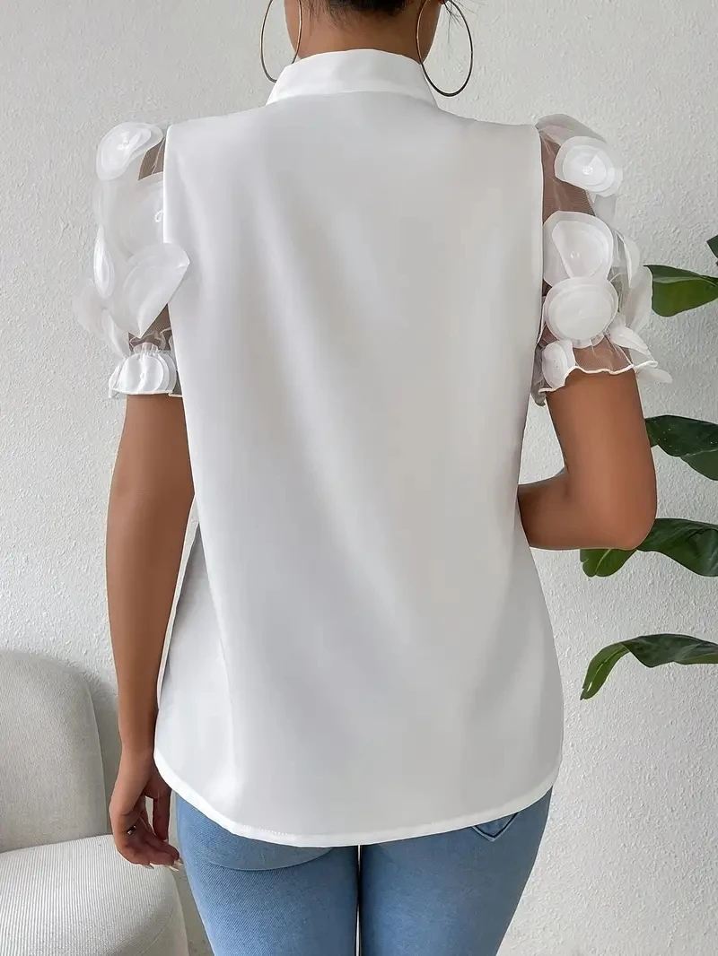 Elevate your casual wardrobe with this refined short-sleeve blouse, featuring a graceful round neckline and sophisticated mesh patchwork detailing. The charming neck tie adds an elegant finishing touch, while the thoughtfully designed silhouette flatters various body types. Perfect for layering or wearing solo, this versatile piece transitions seamlessly from office settings to weekend gatherings, offering contemporary style without compromising comfort.