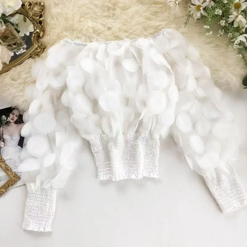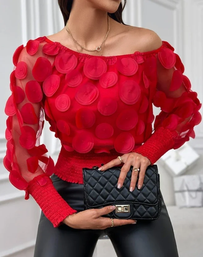Elevate your wardrobe with this refined women's top, featuring an exquisite floral pattern that captures contemporary elegance. The delicate shirred detailing and sheer mesh panels create a sophisticated layering piece, while the off-shoulder neckline and voluminous gigot sleeves deliver a distinctly modern silhouette. Perfect for those seeking understated luxury with artistic flair.