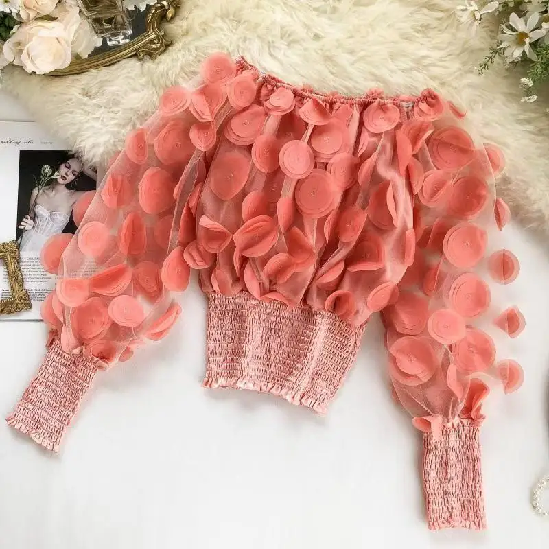 Fashion Women's Shirt Floral Pattern Shirred Sheer Mesh Patch Long Sle