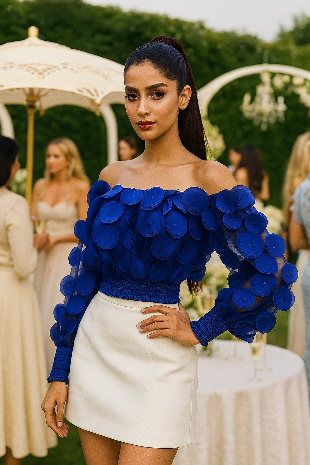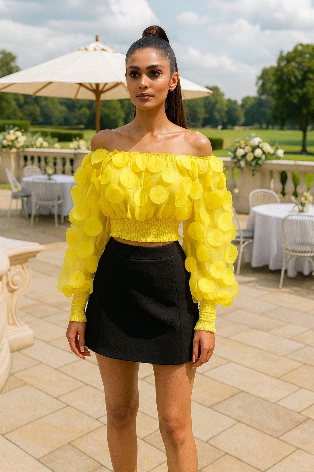 Sheer mesh panels create a sophisticated layering piece, while the off-shoulder neckline and voluminous gigot sleeves deliver a distinctly modern silhouette.