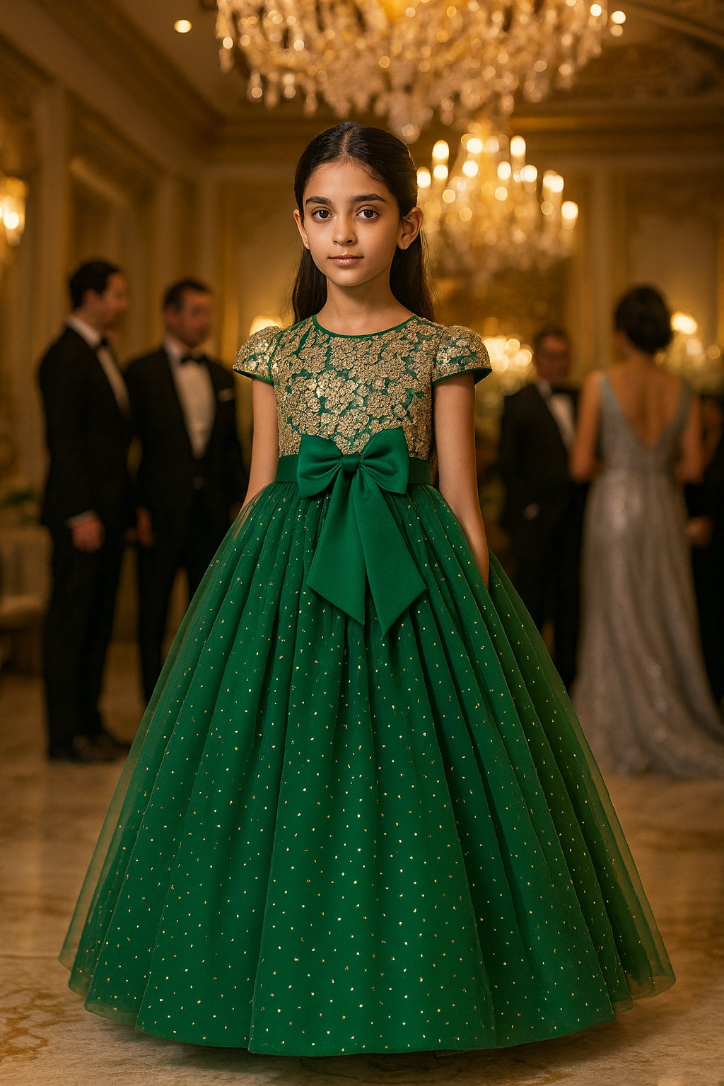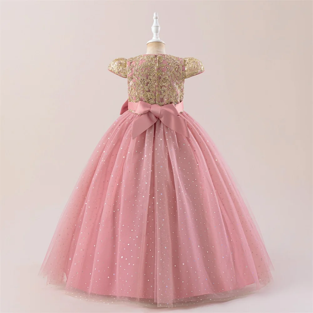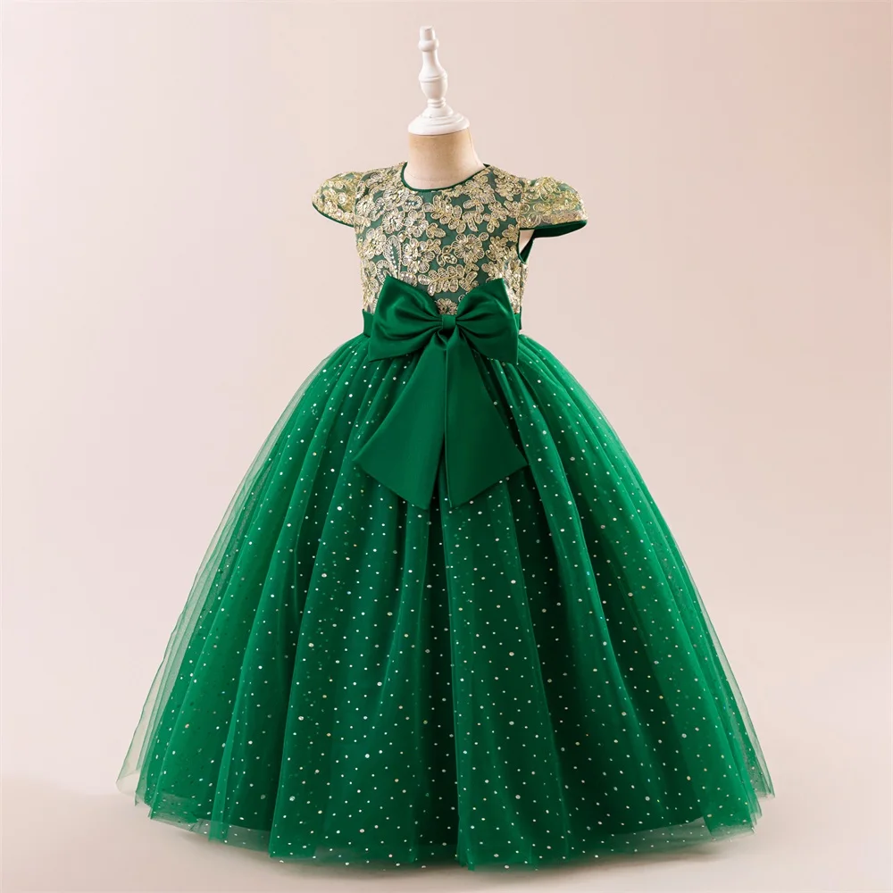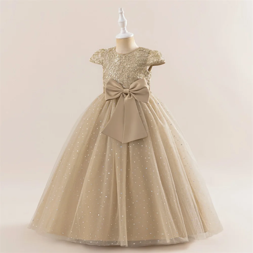 Elevate your daughter's special occasions with this exquisite embroidered party dress. Featuring delicate floral detailing and an elegant oversized bow, this sophisticated gown seamlessly transitions from weddings and proms to birthday celebrations and bridesmaid duties. The refined lace accents and flowing silhouette create a timeless look that captures both grace and youthful charm, making it the perfect choice for memorable moments.