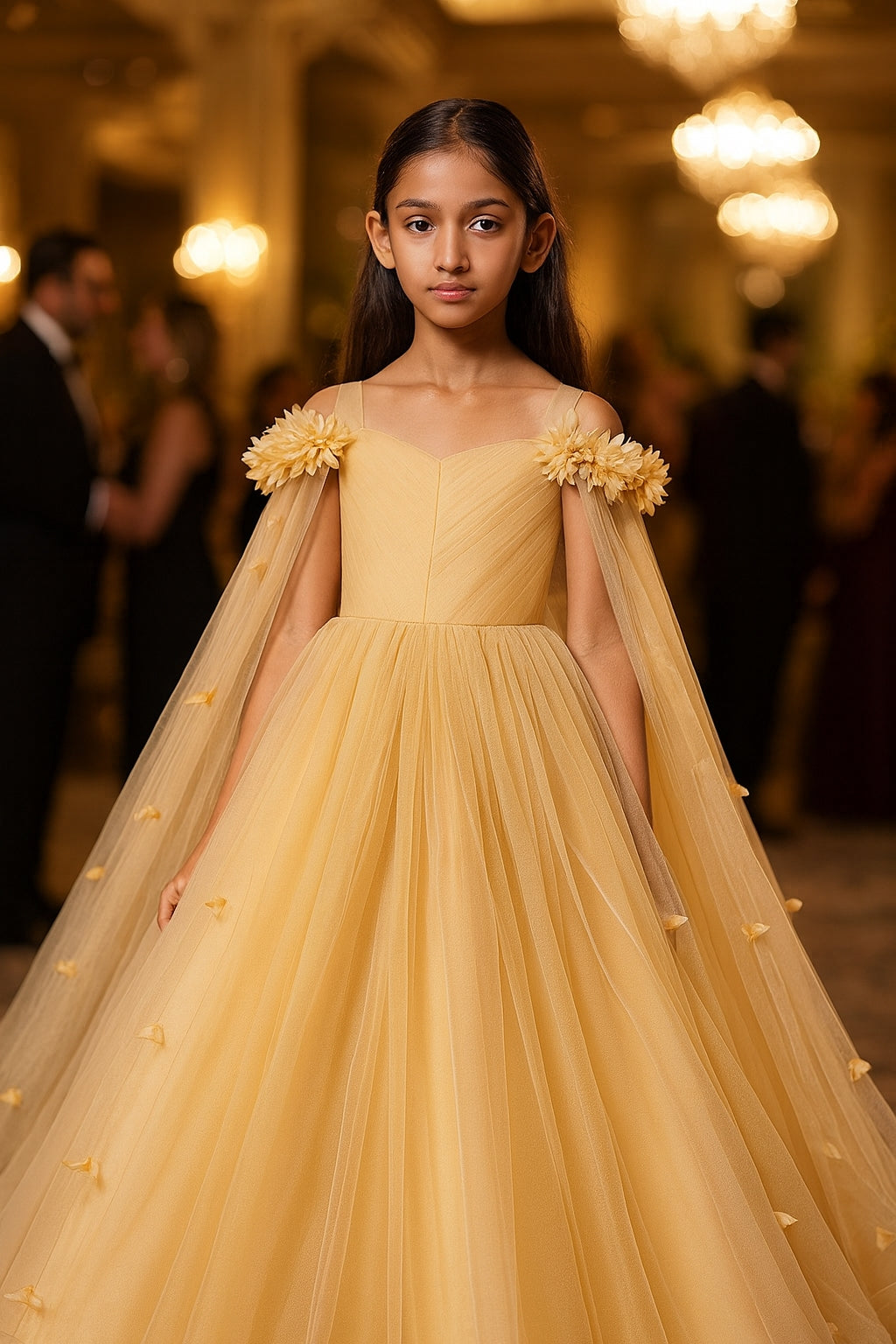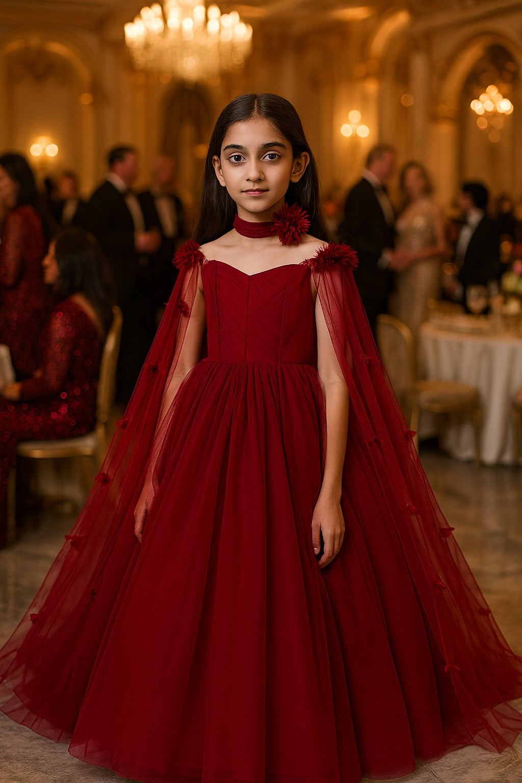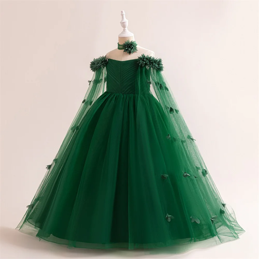 Elegant off-shoulder design meets timeless sophistication in this stunning cape dress for young girls. Crafted from delicate mesh fabric, this piece seamlessly transitions from formal weddings to birthday celebrations and special occasions. The flowing cape silhouette adds dramatic flair while the solid color palette ensures versatile styling. Perfect for flower girls and princess-themed events, this dress combines refined elegance with youthful charm, making every moment memorable.