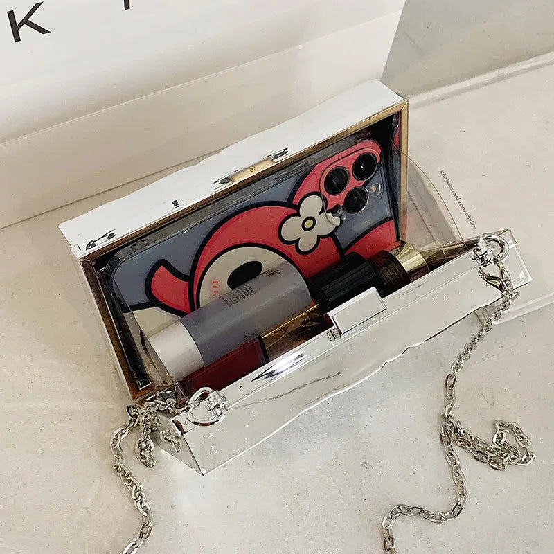 Elevate your evening ensemble with this striking acrylic box handbag, featuring an eye-catching ice crack design that commands attention. The structured silhouette pairs seamlessly with a polished chain shoulder strap, offering versatile styling for both formal occasions and sophisticated casual outings. Crafted for the modern woman who appreciates bold statement pieces, this messenger-style bag combines contemporary aesthetics with practical functionality, making it an essential addition to any fashion-forward wardrobe.