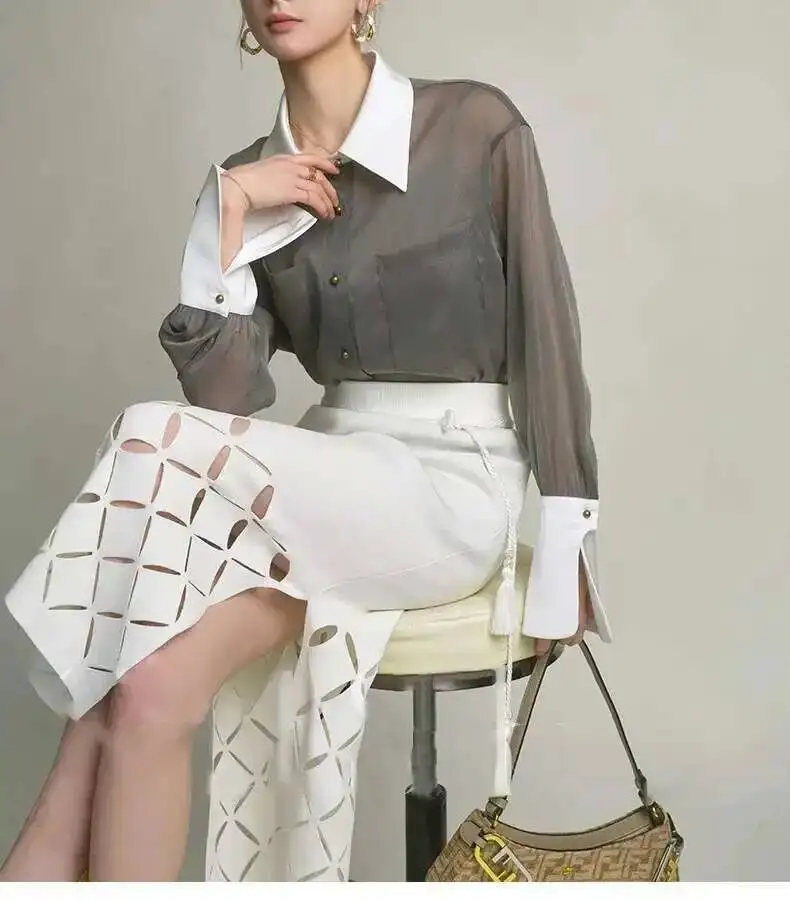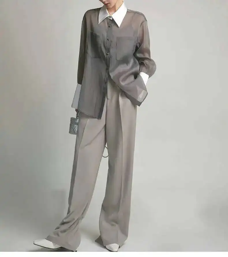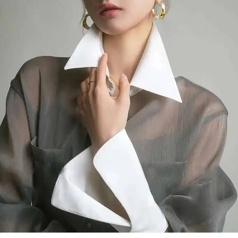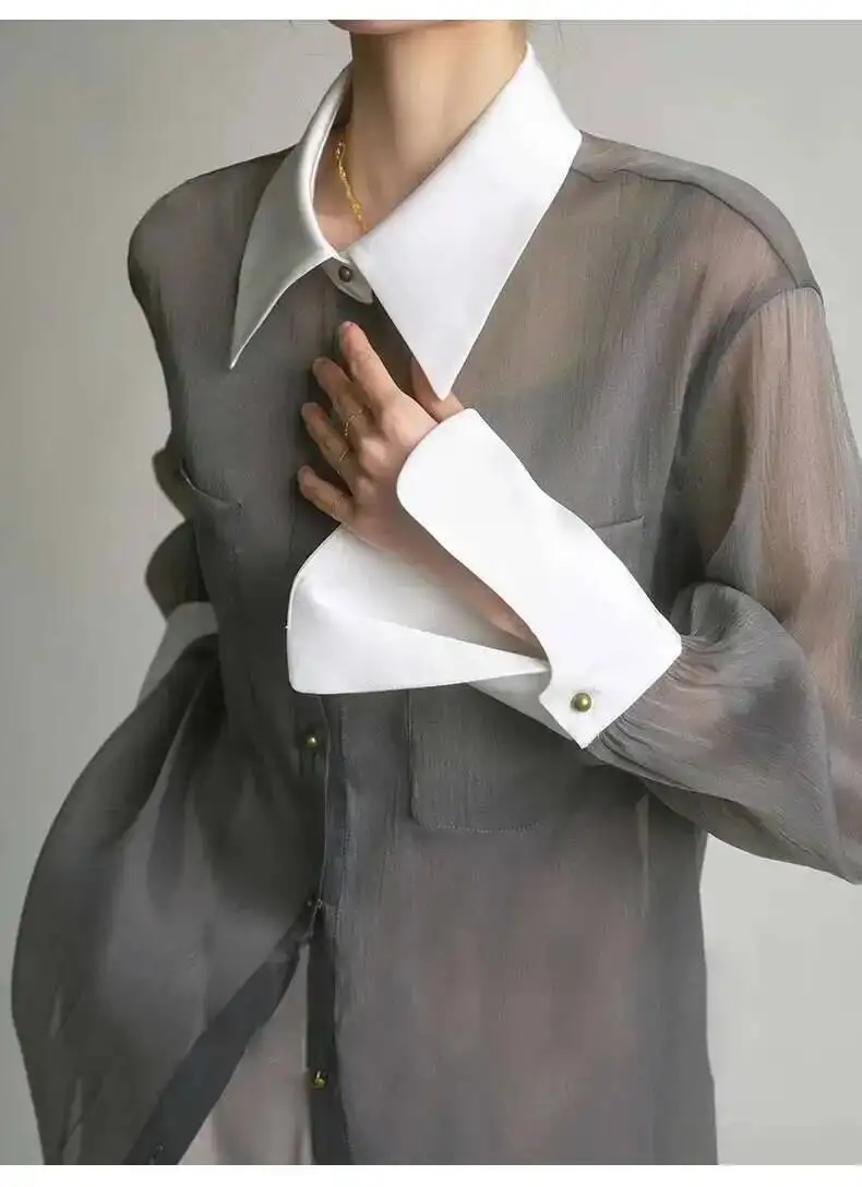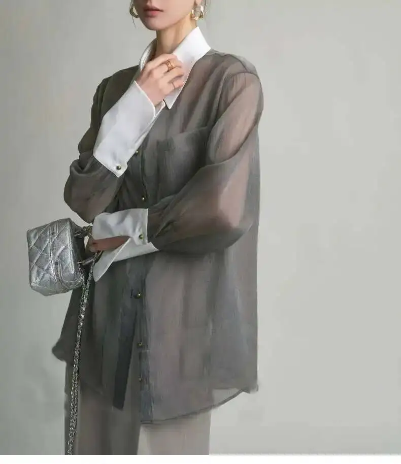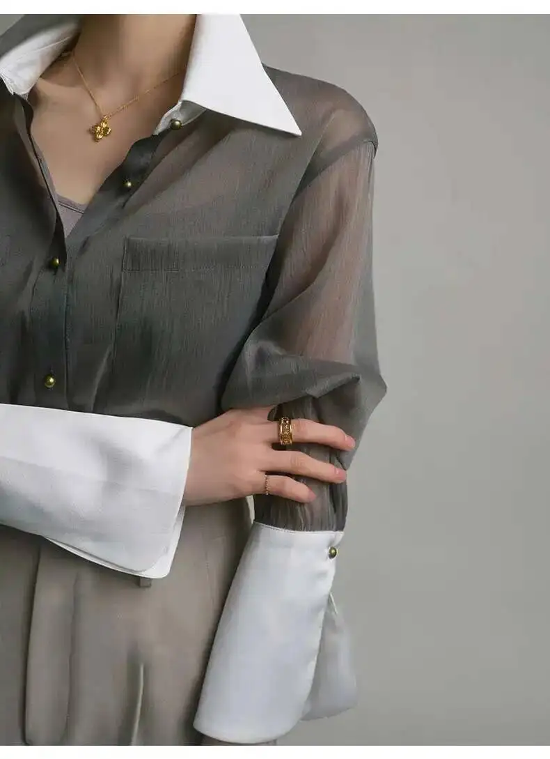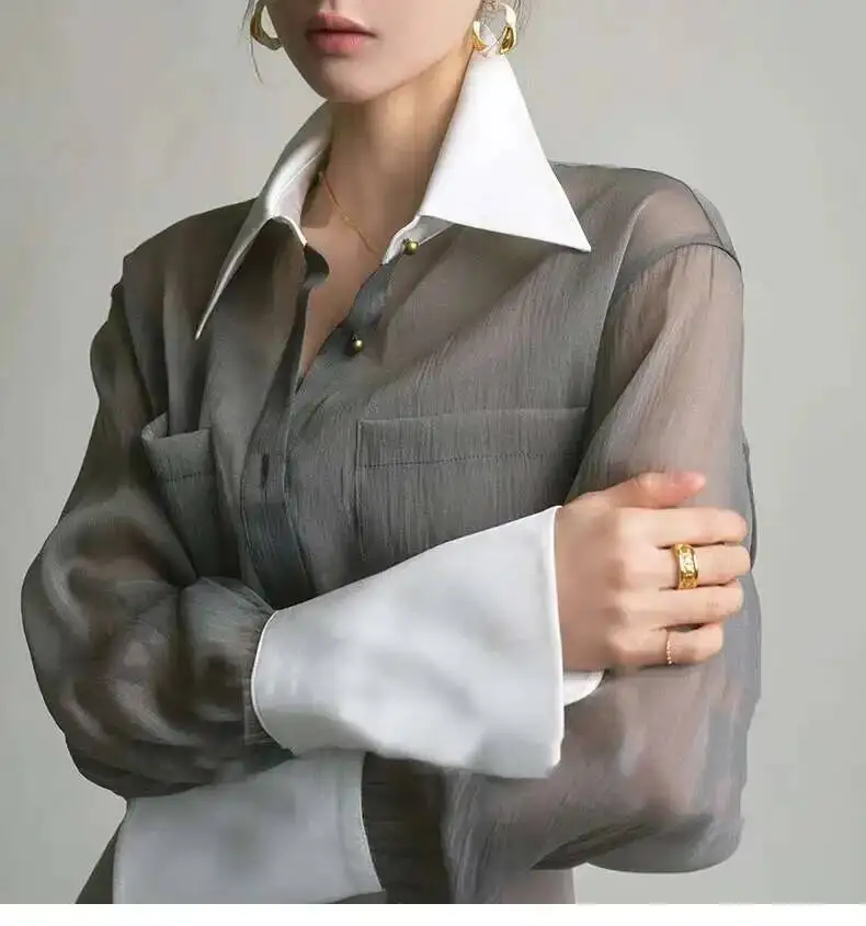 Elegant sunscreen shirt designed for the modern woman, featuring a refined lapel collar and single-breasted closure. The long sleeves provide comprehensive sun protection while the loose, comfortable silhouette ensures effortless style. Detailed stitching adds a polished touch to this versatile layering piece, perfect for both casual outings and relaxed professional settings. Pair it with your favorite sling top for a coordinated, fashion-forward look.