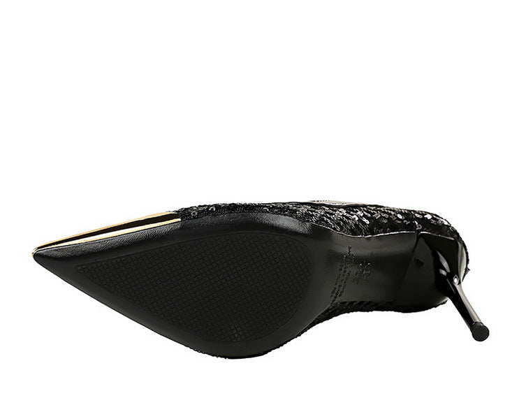 Elevate your style with these luxurious women’s pumps featuring a sequin mesh design and a sleek metal pointed tip. Standing at 9.5 cm, the stiletto heels offer a refined silhouette, perfect for formal events and glamorous parties.
