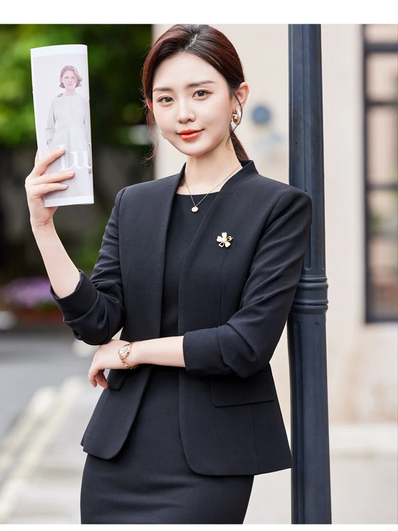 Elevate your professional wardrobe with this refined two-piece dress suit, expertly tailored for the modern businesswoman. Featuring long sleeves and a sleek monochromatic design, this slim-fit ensemble delivers timeless sophistication for the office. The solid construction ensures versatility, pairing effortlessly with your existing pieces while maintaining an impeccably polished appearance throughout your workday.