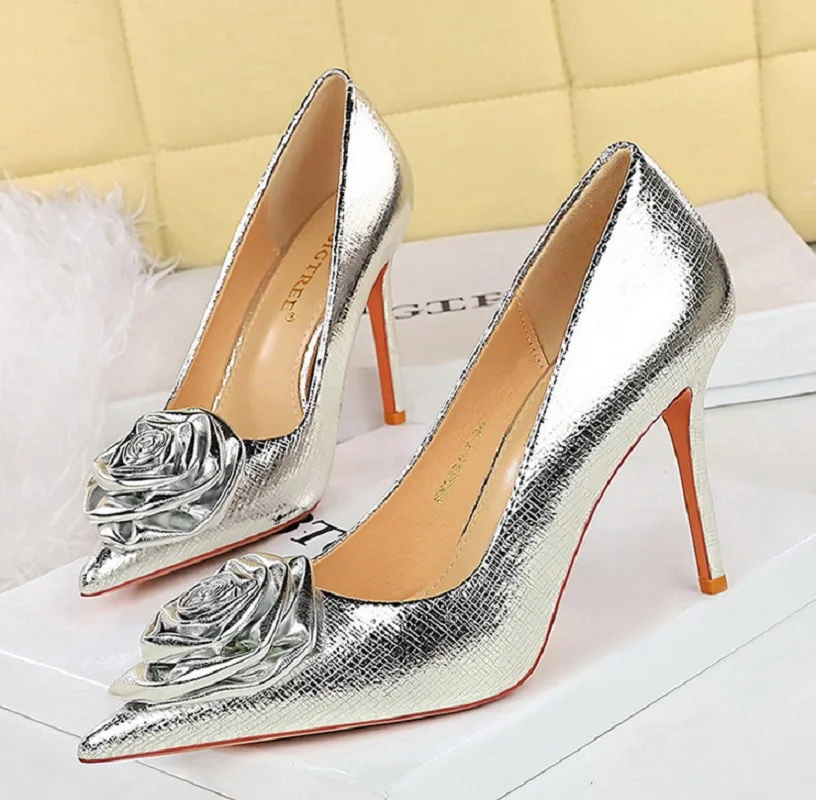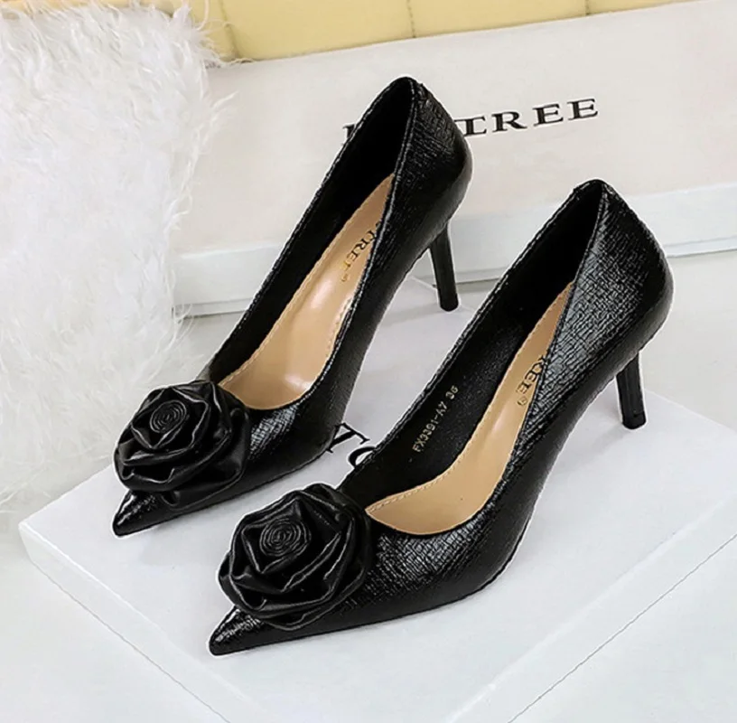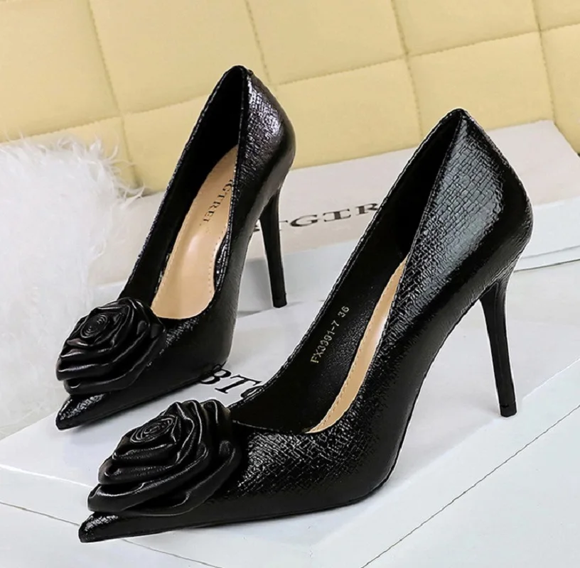 Elevate your style with our Patent Leather Flowers Women Pumps. These elegant shoes feature a pointed toe and thin, low heels, adding a touch of sophistication to any outfit. The patent leather design and delicate flower detailing make them perfect for weddings and parties. Enhance your look with these sexy and stylish shoes.