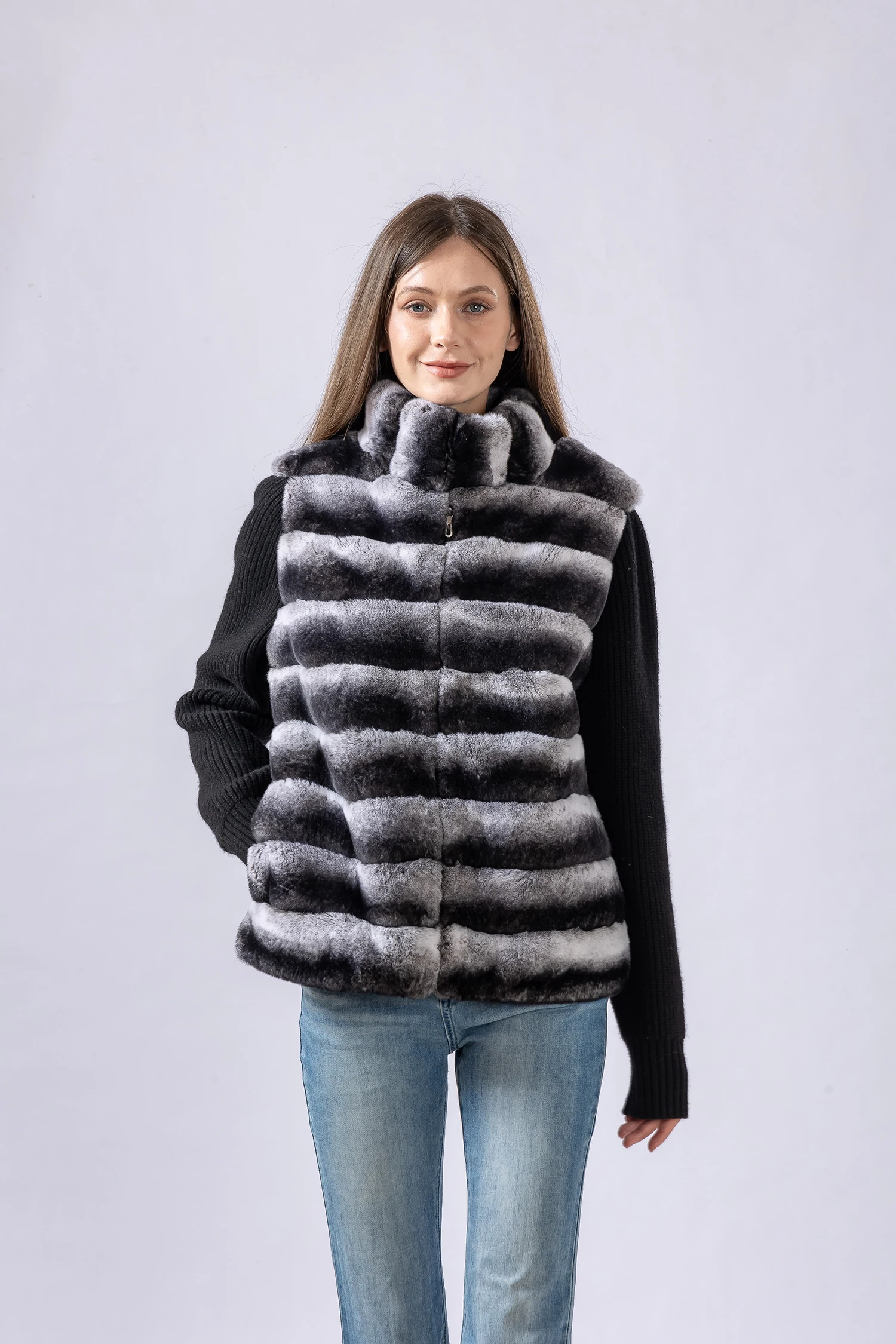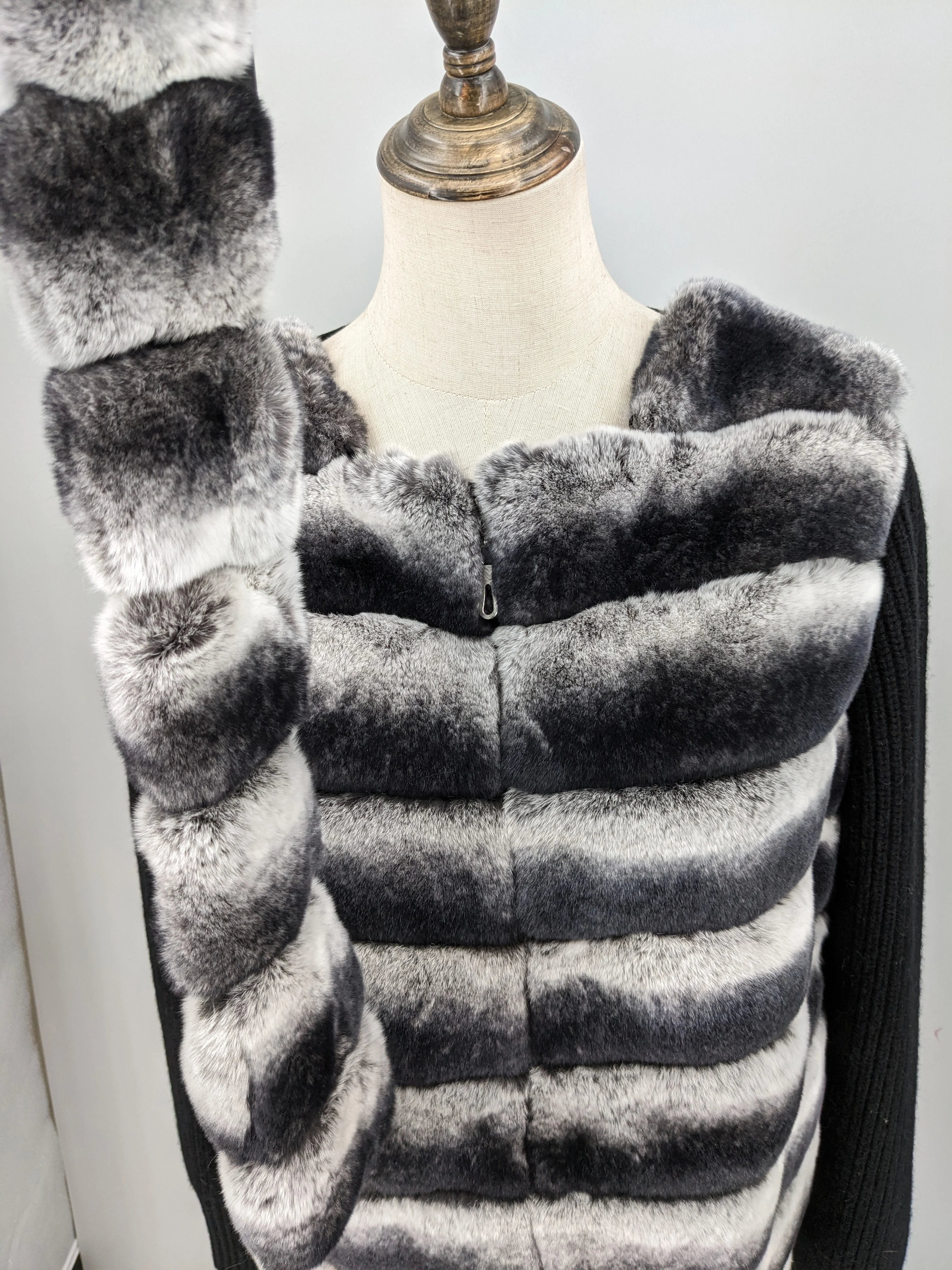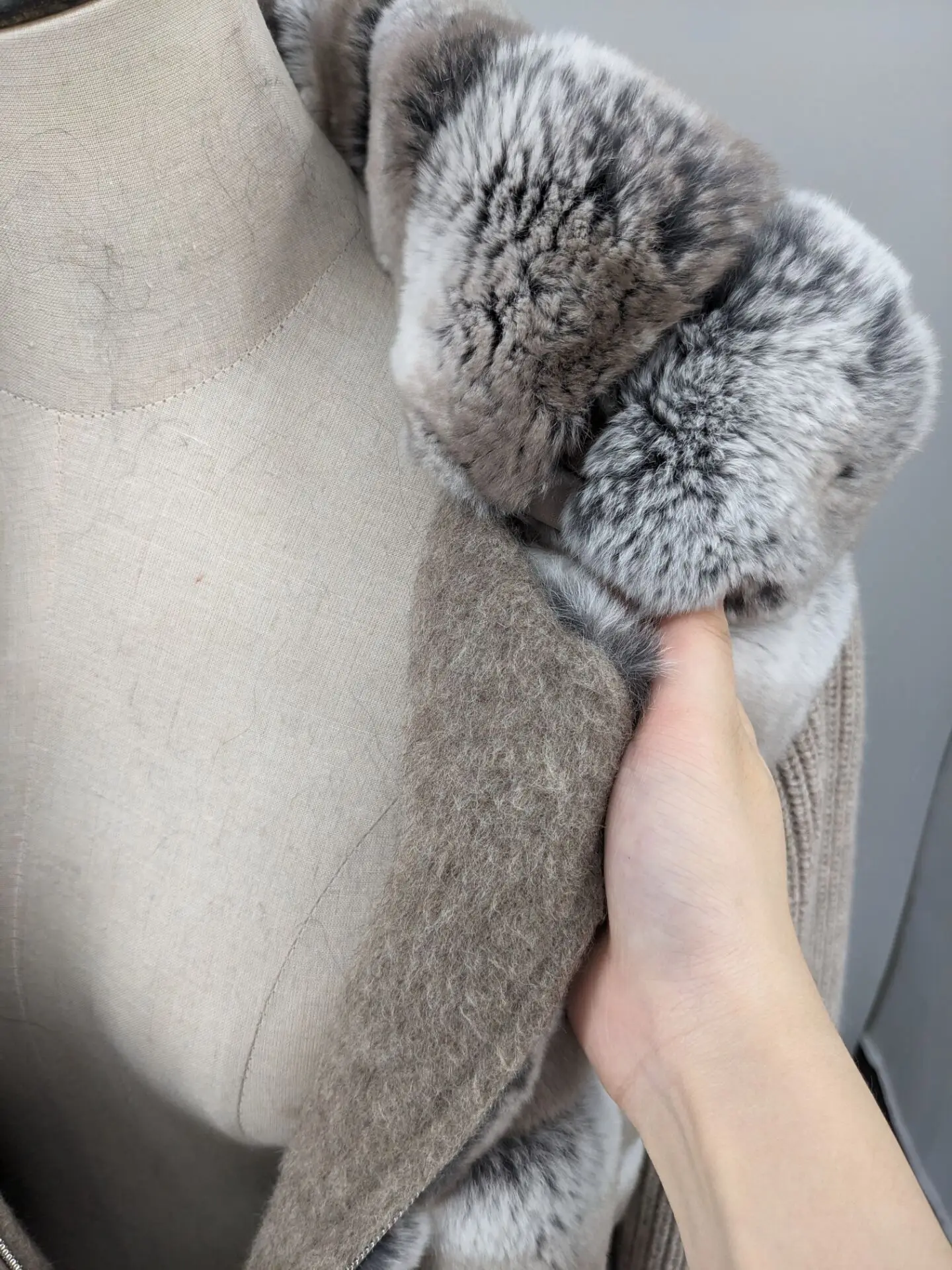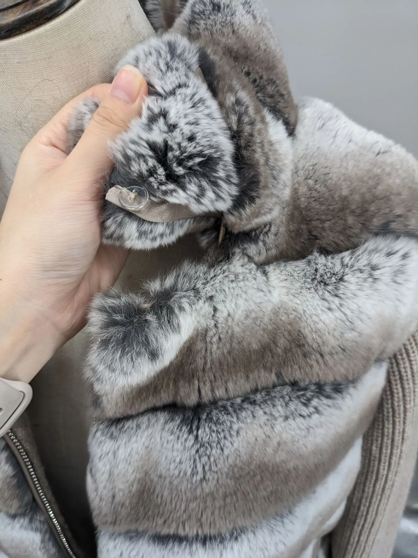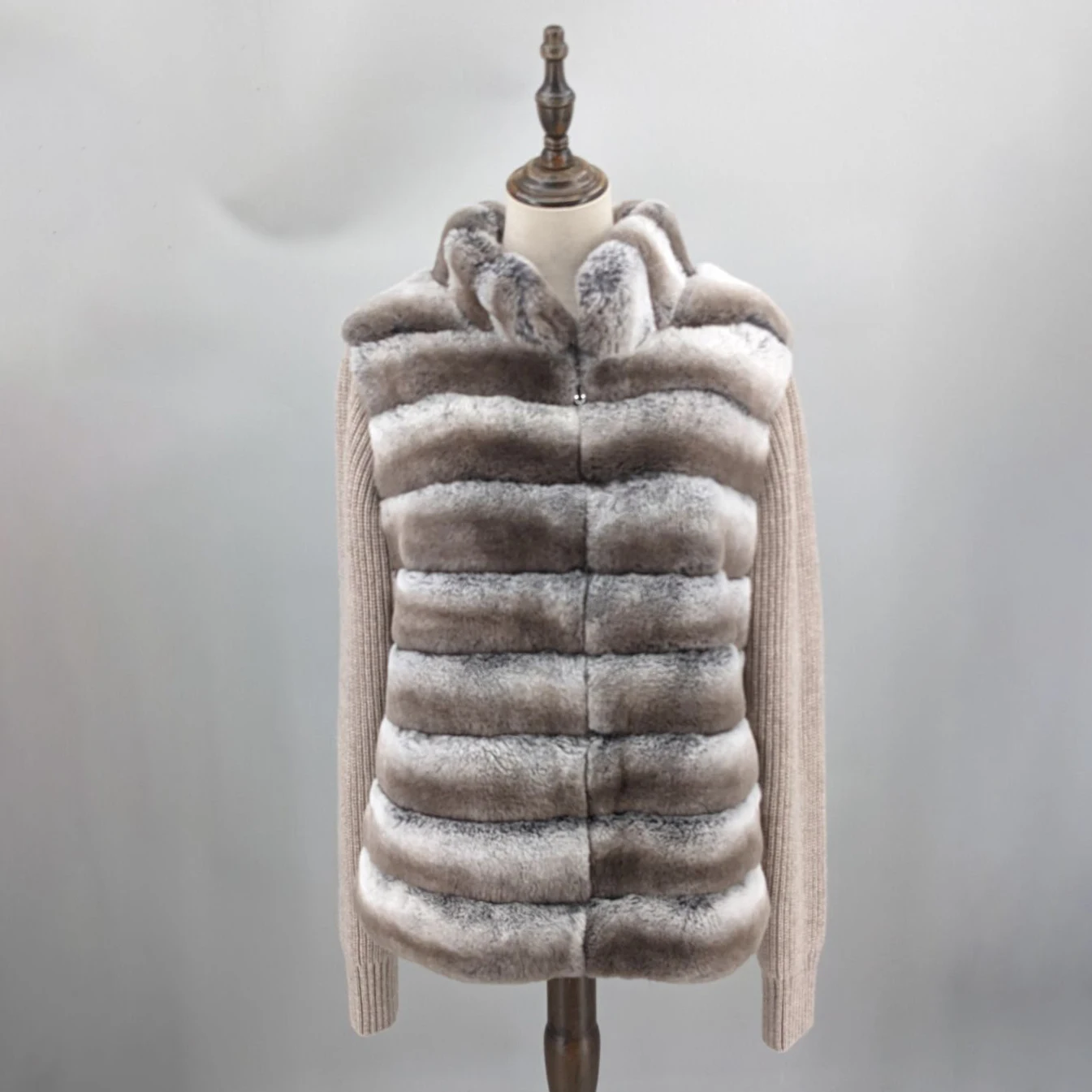 Elevate your winter wardrobe with this luxurious Rex rabbit fur coat, expertly crafted for the discerning woman. Featuring genuine fur combined with refined knit construction, this sophisticated jacket delivers exceptional warmth without compromise. The distinctive stand collar adds an elegant touch, while the substantial weight ensures superior insulation through the coldest months. A timeless investment piece that seamlessly transitions from casual outings to refined occasions, this outerwear exemplifies understated luxury and enduring style.