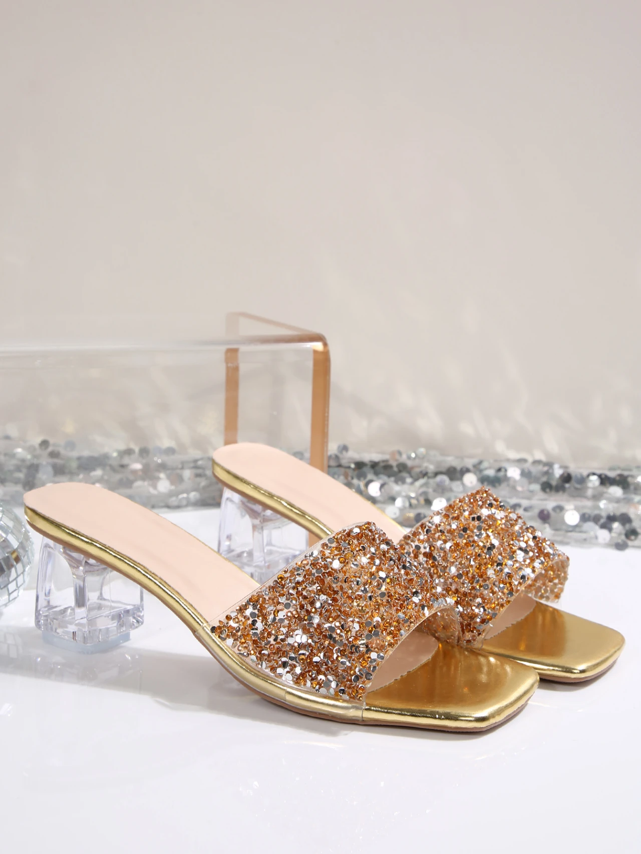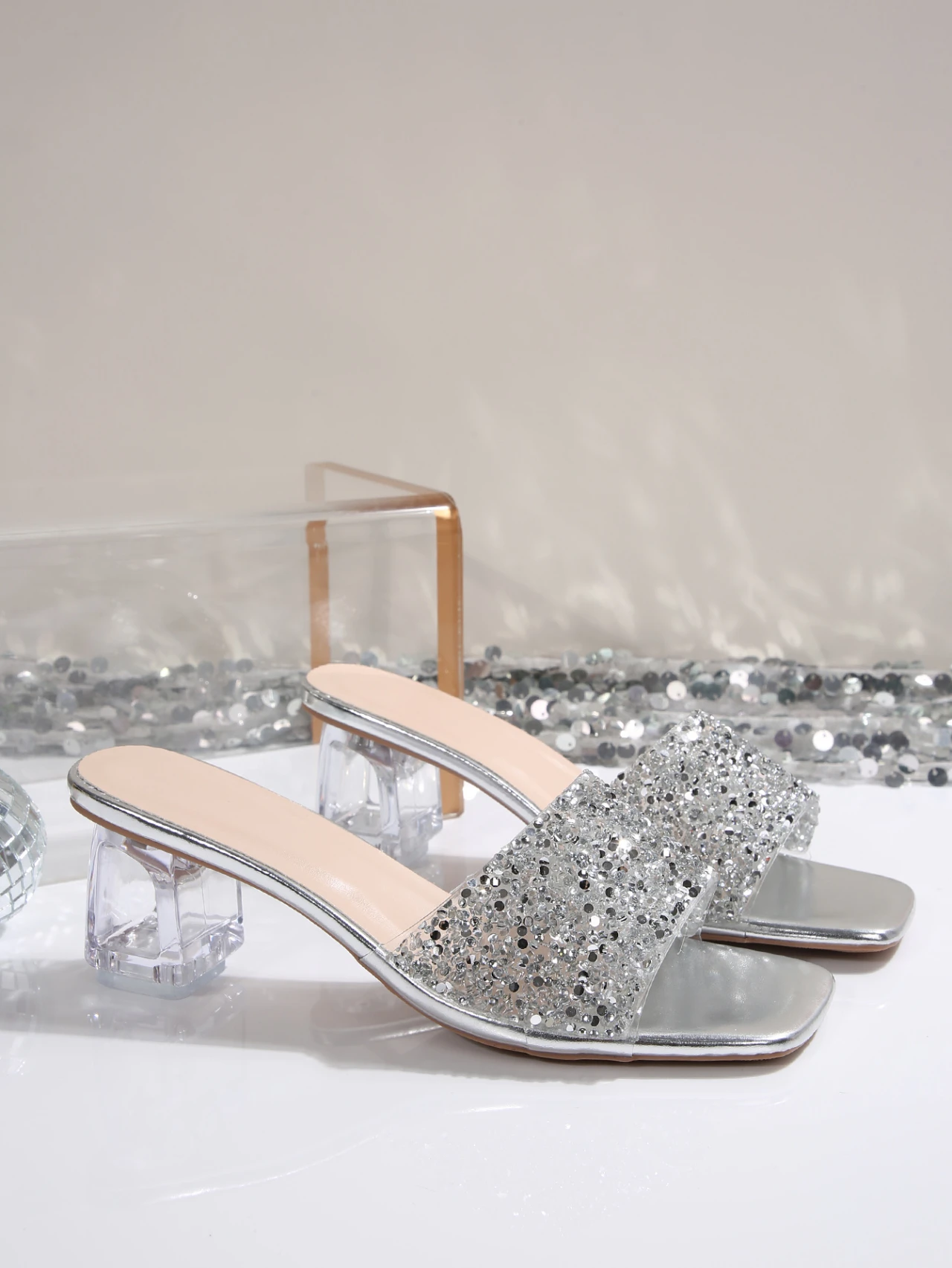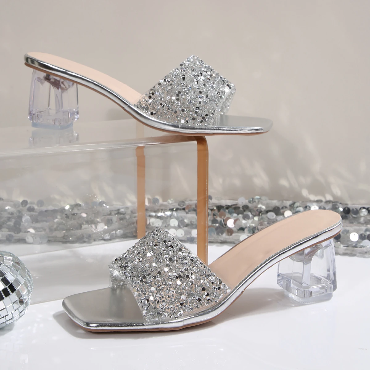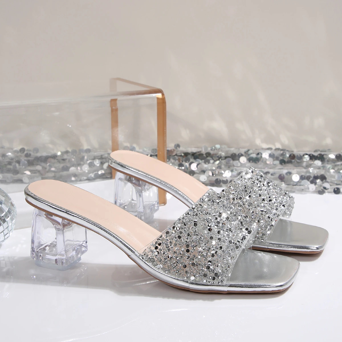 Elevate your summer wardrobe with these glamorous sequin-embellished heeled slippers, designed for the modern woman who refuses to compromise on style. Featuring a striking square toe silhouette and transparent elements, these glitter slides deliver an effortless blend of sophistication and contemporary flair. Perfect for casual outings or evening occasions, they transform any ensemble into a statement look while maintaining the comfort of a slip-on design.