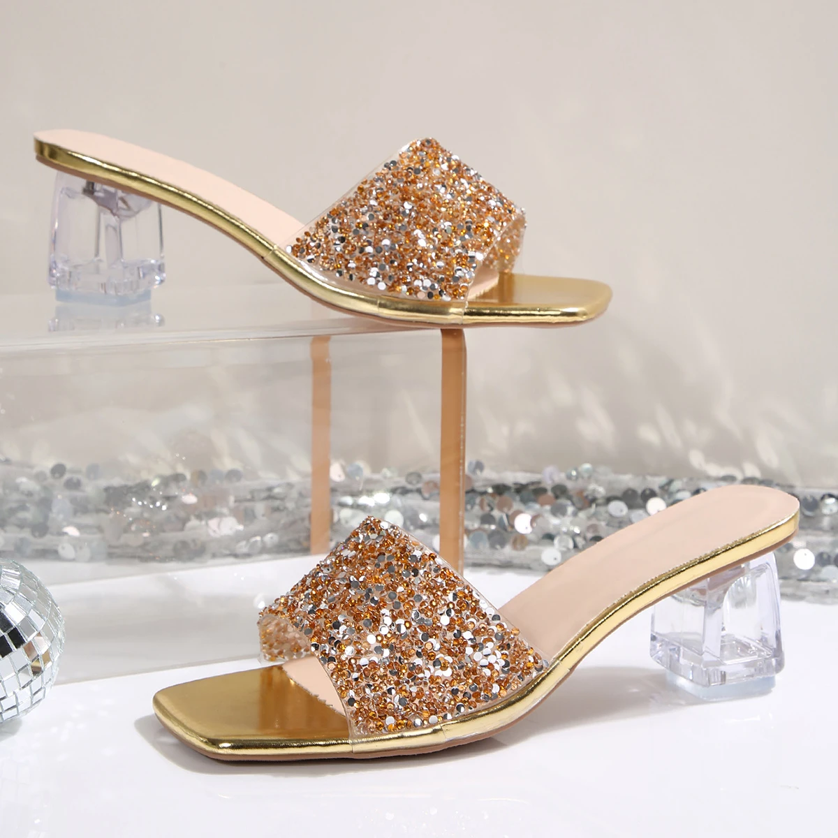 Shiny Sequins High Heel Slippers for Women Summer Fashion Square Toe T