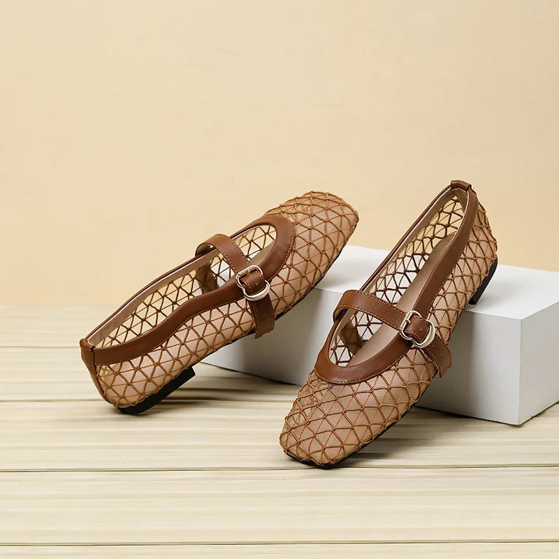Fishnet Ballet Flats Square Toe Breathable Hollow Mesh Sandals Casual and Comfortable Mary Jane Shoes